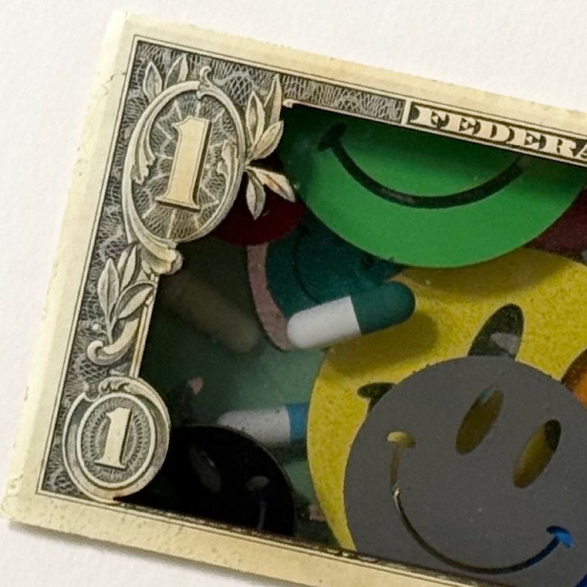 Original, One-Off Currency Artwork - Based on Genuine US Dollar Bill. Incorporating 3D articles and Bespoke, floated Embellishments - Utilising graffiti applications, & UV Protective, High Gloss Resin Coating.